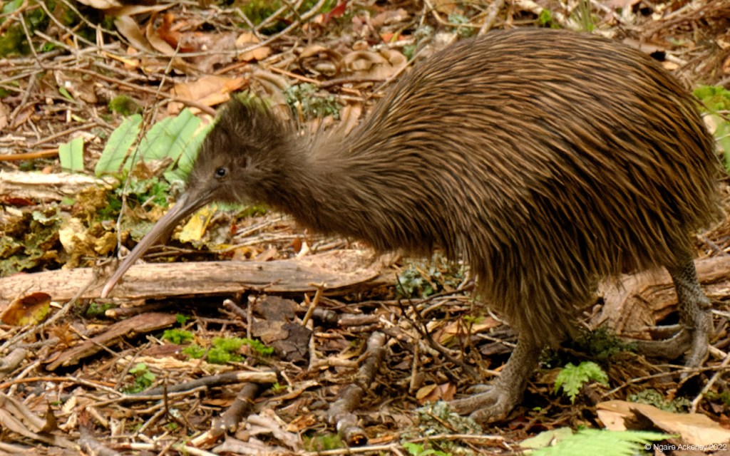 It was a Stewart Island Brown Kiwi, one of 30-40 kiwi that act strange by sharing the nesting with their partner and taking turns feeding during the day/night. A couple behind us spotted it first walking across the track, then they told us as they spotted it along the forest floor below!